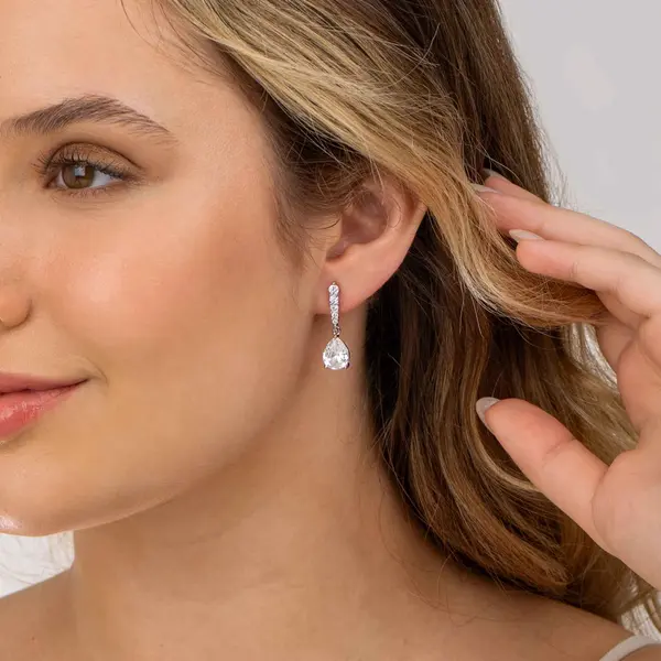 Brinco Banho de Ródio Cravejado e Gota em Zircônia Pendente