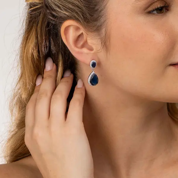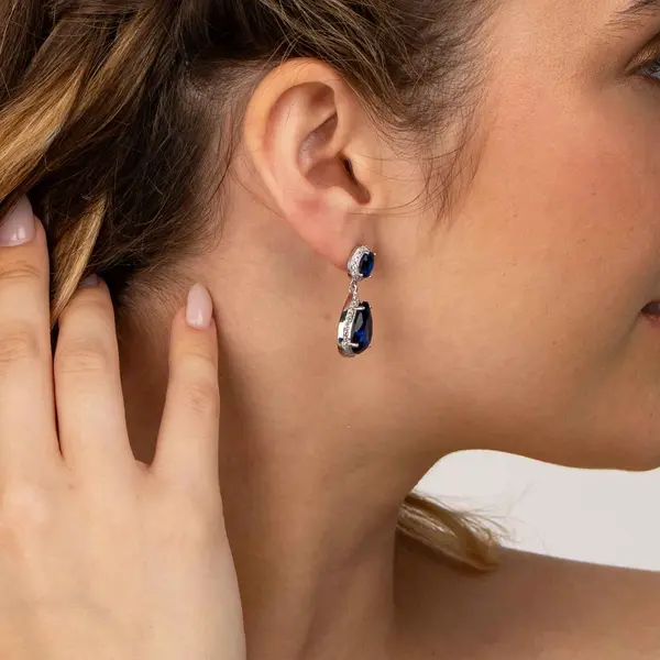 Brinco Banho de Ródio Gota Cravejada Grande Azul