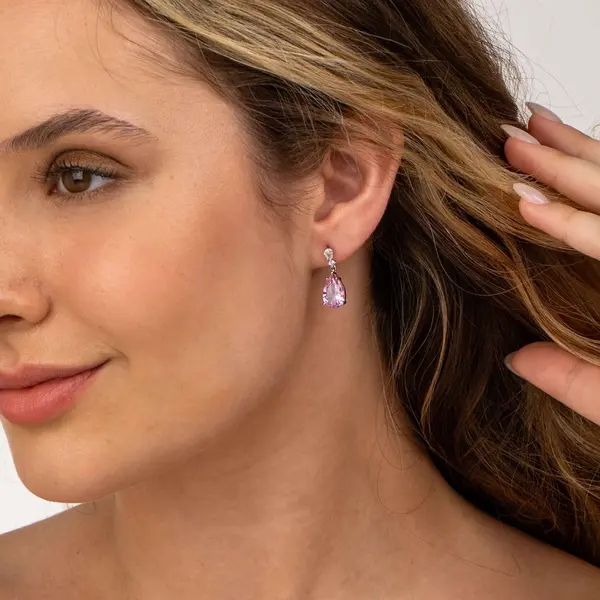 Brinco Banho de Ródio Gota em Zircônia Rosa