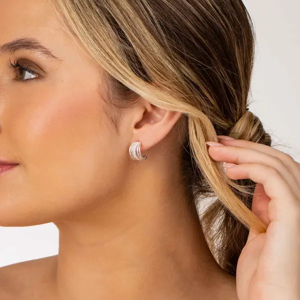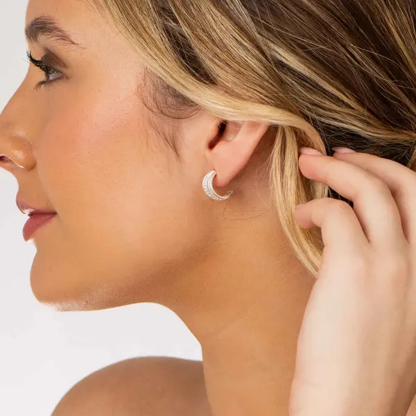 Brinco Prata Meia Argola Filetes Lisos e com Zircônia
