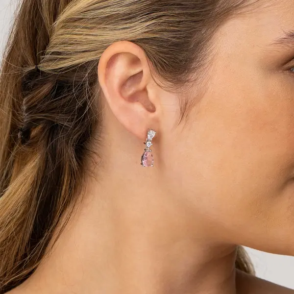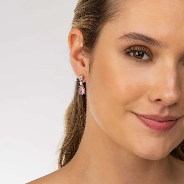 Brinco Prata Rodinada Gota em Zircônia Rosa