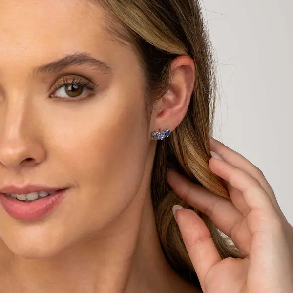 Brinco Prata Rodinada Três Zircônias Quadradas Azuis