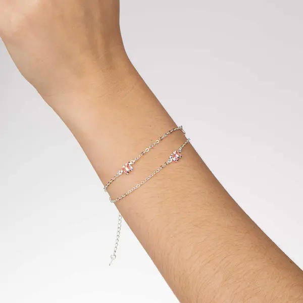 Pulseira Prata Leve Dupla Borboletas Rosas