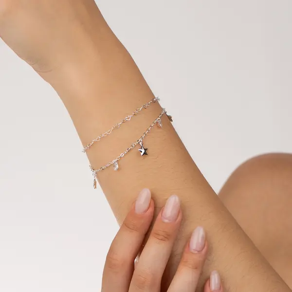 Pulseira Prata Leve Dupla Estrelas e Zircônias